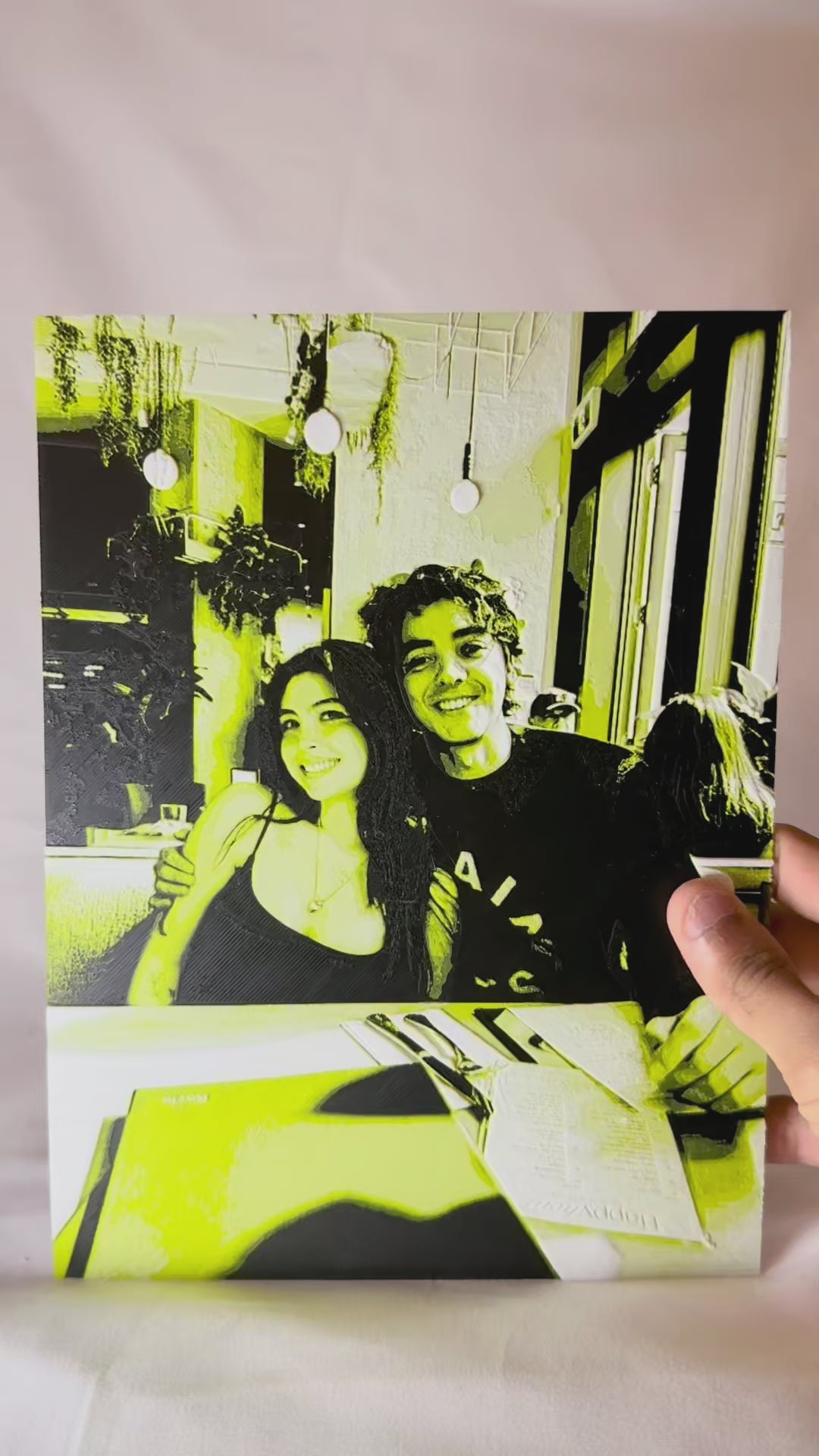 THIS IS A CUSTOM 3D-PRINTED FRAME CREATED FROM A REAL PHOTOGRAPH.THE IMAGE IS CAREFULLY TRANSFORMED INTO A DETAILED, DIMENSIONAL DESIGN THAT BRINGS DEPTH AND CHARACTER.EACH PIECE IS INDIVIDUALLY CRAFTED, MAKING EVERY FRAME UNIQUE. THE BACKGROUND IS DESIGNED TO ENHANCE THE PHOTO, NOT DISTRACT FROM IT.SUBTLE DETAILS APPEAR AS LIGHT HITS THE SURFACE FROM DIFFERENT ANGLES. A MODERN WAY TO TURN A MEANINGFUL MOMENT INTO A LASTING DISPLAY.